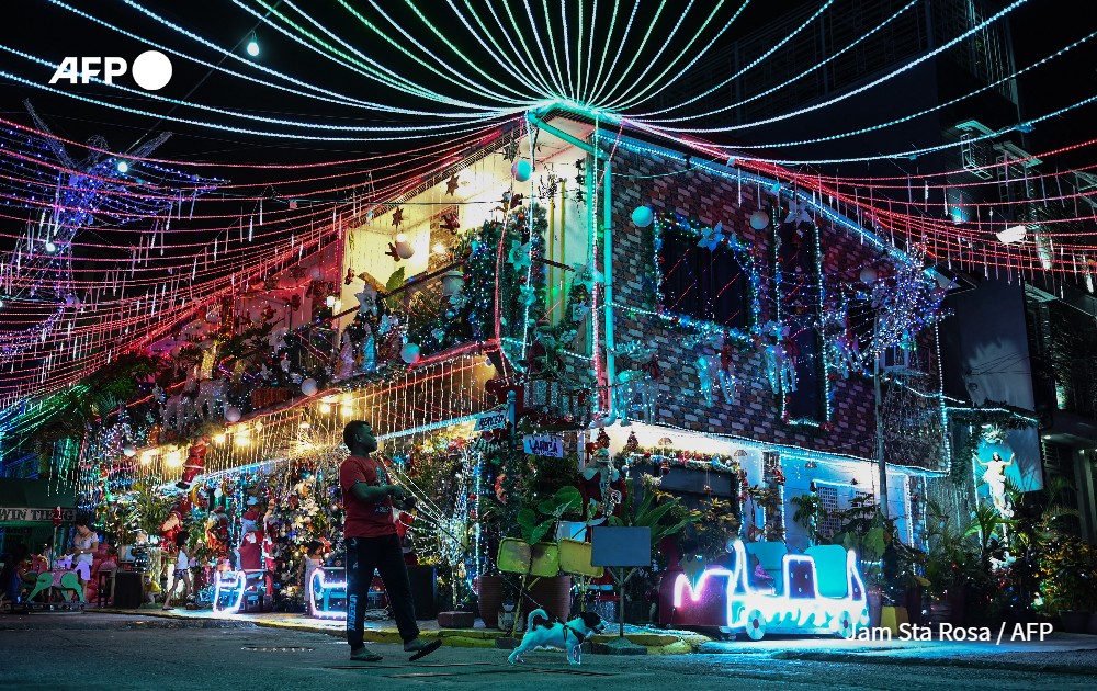 In this photo taken on December 21, 2022, a man walks with a dog past a Christmas-themed house in Manila, Philippines.