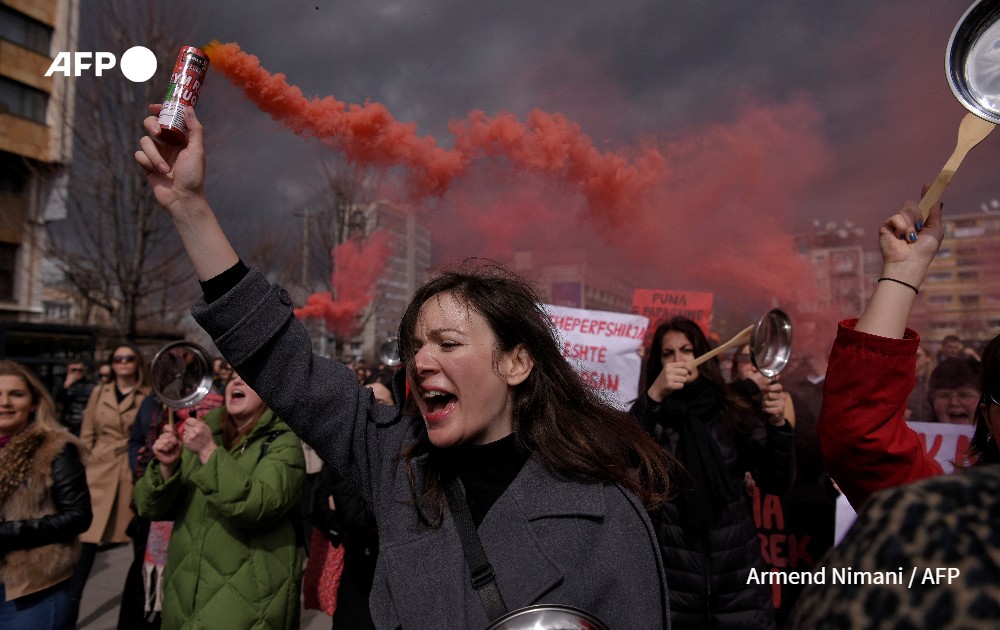 Women take part in a rally for gender equality and against violence towards women to mark the International Women's Day in Pristina, on March 8, 2023.