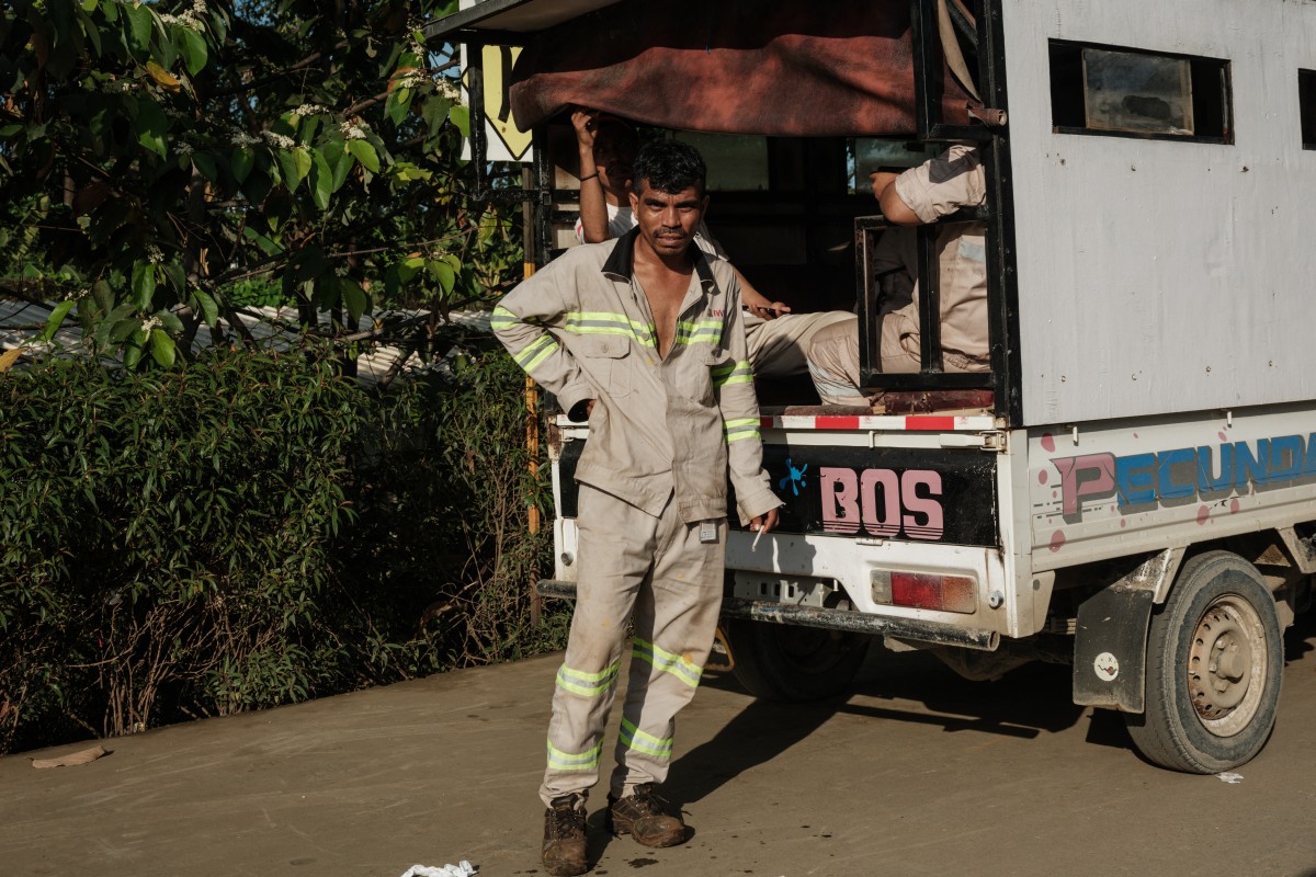 (5) Un ouvrier fume une cigarette près d’un véhicule, à côté du parc industriel de Weda Bay (WBIP), grand centre de traitement du nickel. Le territoire des Hongana Manyawa, tribu indigène, a été grignoté par l’un des plus grands projets miniers de nickel au monde. Halmahera central, Maluku nord, 14 avril 2025. © Yasuyoshi Chiba / AFP