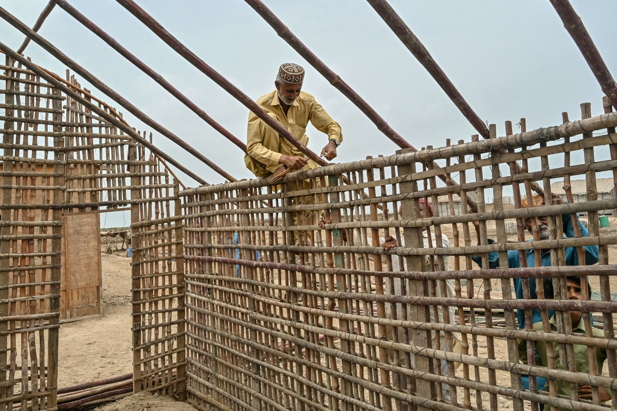 (4) Un pêcheur construit sa nouvelle maison à l’aide de bambous à Keti Bandar, près du delta de l’Indus, Pakistan. L’intrusion de l’eau de mer a provoqué l’effondrement de l’agriculture et de la pêche locales. 25 juin 2025. © Asif Hassan / AFP