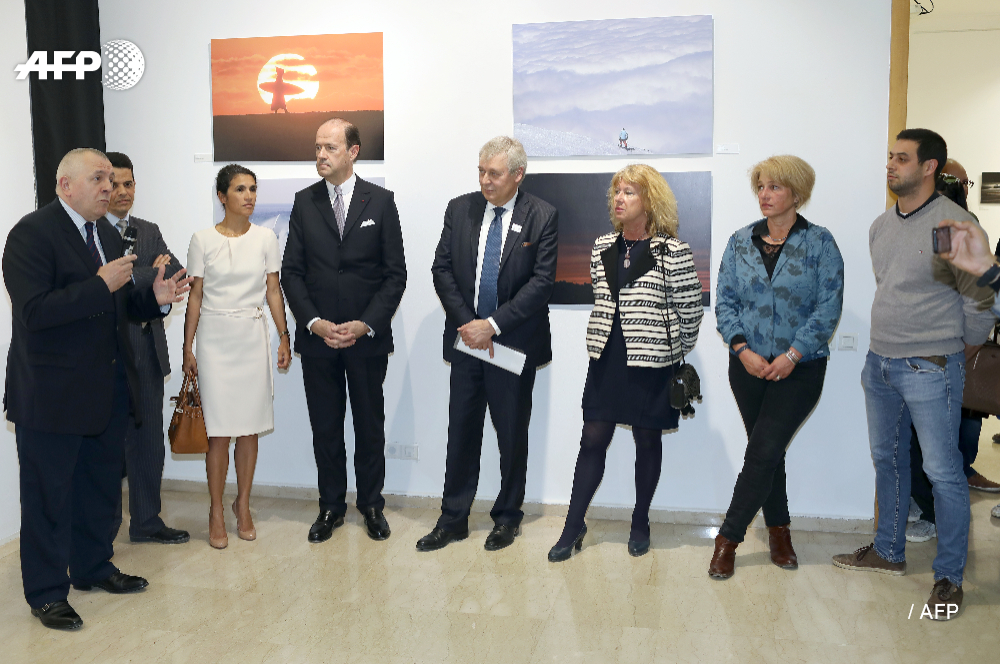 RABAT - 06/04/2018 - Vernissage de l’exposition  AFP « Sports et émotions »: (de droite à gauche) , les organisateurs, Fadel Senna, photographe AFP, Sophie Pons, directrice de l’AFP-Rabat et Muriel Augry-Merlino, directrice de l’Institut, aux côté de l’ambassadeur du Sport Philippe Vinogradoff, de l’ambassadeur de France Jean François Girault, la conseillère économique Marie-Cécile Tardieu, Yacine Bellarab du ministère marocain des Sports et Christian Chaise, directeur régional de l’AFP pour le Moyen Orient & Maghreb.  © AFP