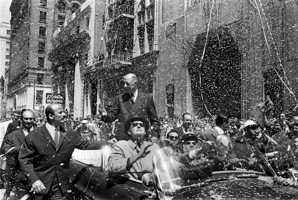 Le président Charles de Gaulle en visite officielle à San Francisco en avril 1960. Accueilli par des confettis lancés par une foule enthousiaste, l’homme politique français est venu célébrer l'amitié franco-américaine. Cette image de Sam Schulman capture un instant festif  des relations internationales.