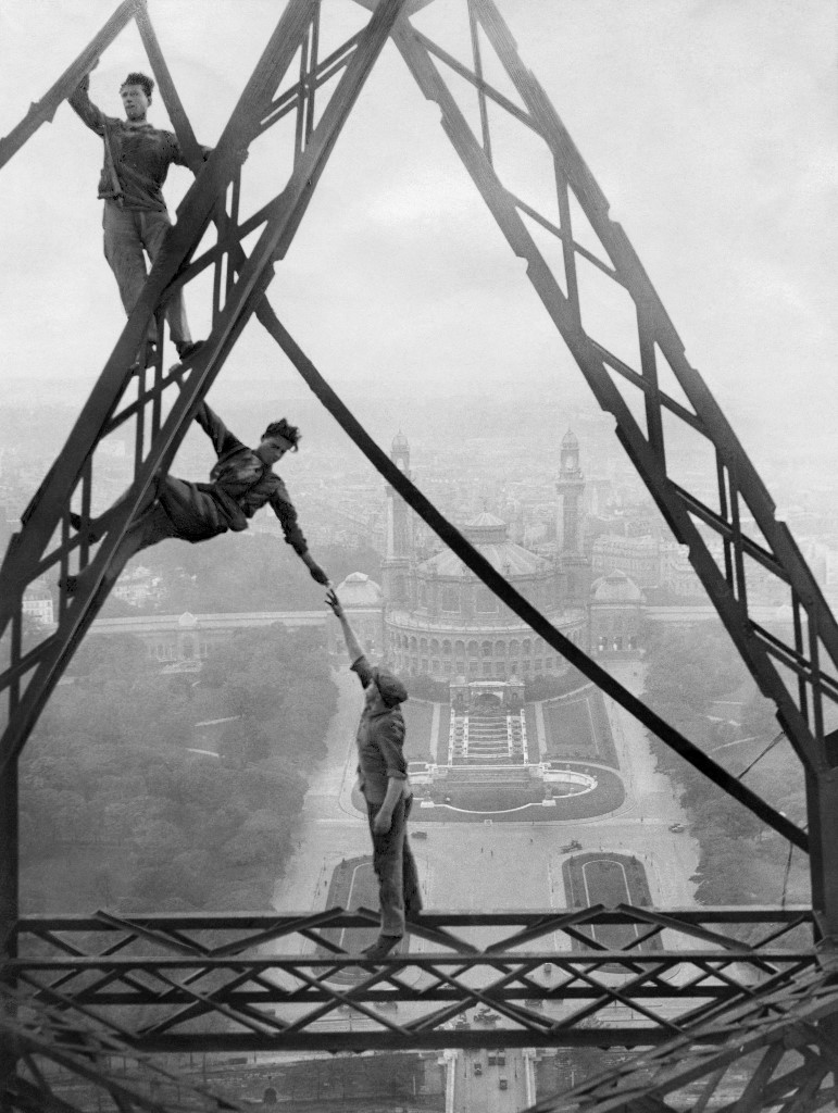 Les voltigeurs : trois ouvriers travaillent sur la tour Eiffel à Paris dans les années 1930, sans harnais de sécurité ni équipement de protection. À l’arrière-plan, le palais du Trocadéro avant qu’il ne soit détruit et remplacé par le palais de Chaillot à l’occasion de l'Exposition universelle de 1937.